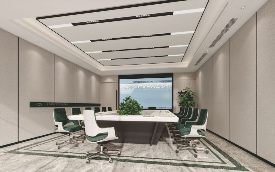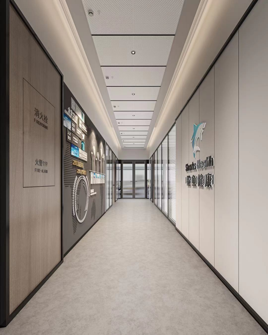 綠色是健康色,也是鯊魚健康的企業(yè)色,于是我們把綠色融入到了整個設(shè)計中,搭配大面積暖色調(diào)的米白色,首先從色彩上去提升視覺的舒適度。再結(jié)合企業(yè)的各個功能需求,每個環(huán)節(jié)先后的順序,參觀動線去做整個平面空間布局。