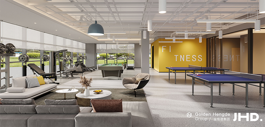 在一樓的側(cè)后區(qū)域還有一個相對獨立且人文的空間,一個擁有150平的活動交流室!職員們可以在這里社交、娛樂、健身和組織一些團建活動等,后面甚至還配備了獨立的更衣室和男女浴室。當室外光線投射散發(fā)出來,整個室內(nèi)空間明快且舒適,這種環(huán)境下,能更快地調(diào)整員工們的狀態(tài),激發(fā)他們的創(chuàng)造性思維。
