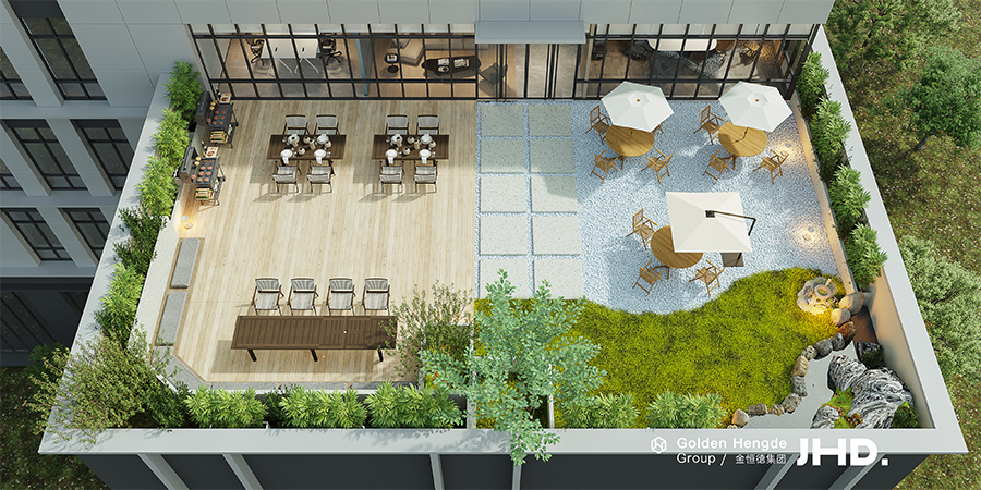 自然對人的健康、情緒、社會行為、認知能力以及生產(chǎn)力都有積極影響。人生來便有與大自然親密接觸的愿望。為滿足空間對于自然的追求,我們對四樓的露臺加以利用,引入了半開放式的空中花園,為企業(yè)員工創(chuàng)造了一個休憩、對話和親近自然的環(huán)境。
