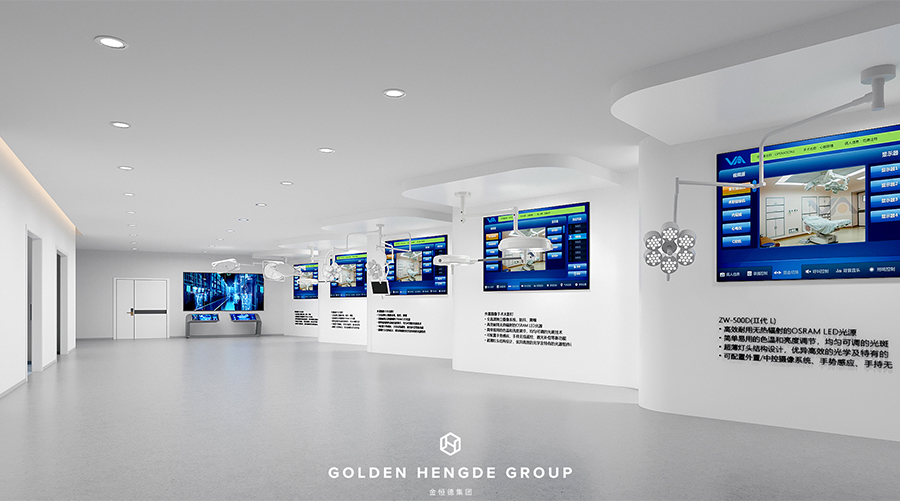 除此之外,辦公樓內(nèi)還專門設(shè)置了公司的產(chǎn)品展廳。入口處的陳列區(qū)以階梯式排列,產(chǎn)品配套的LED大屏同步介紹,使得客戶可以更直觀地了解每個(gè)產(chǎn)品的性能。同時(shí),空間內(nèi)還配有多間模擬醫(yī)療手術(shù)室,這些手術(shù)室均搭配公司的產(chǎn)品,不僅能更好地展示產(chǎn)品,還能讓客戶身臨其境地感受到產(chǎn)品的魅力。